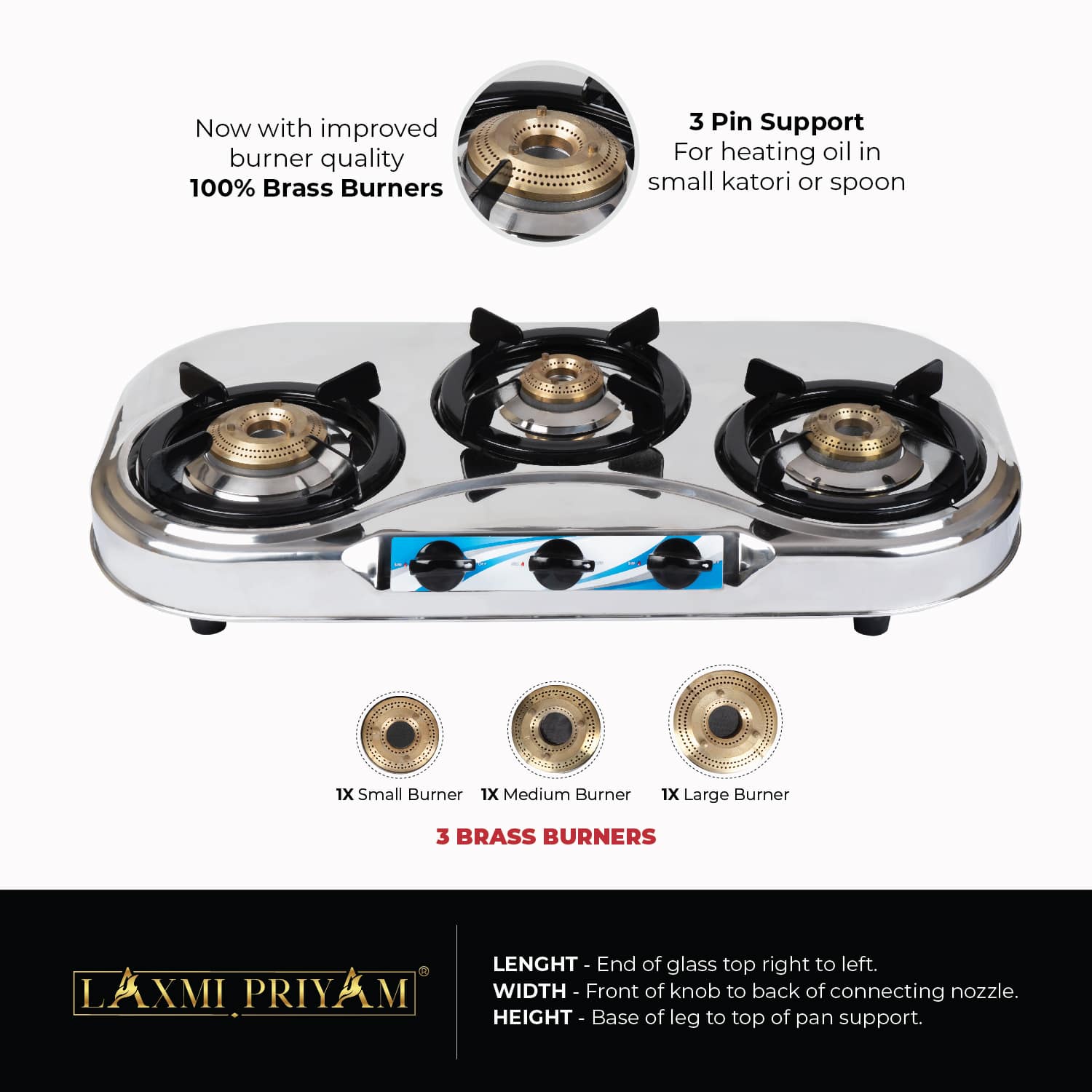Laxmipriyam presents to you the classic version of toughened glass cook top in black color. It has been carefully assembled to provide a classic look to your kitchen along with high effeciency cooking. The stove has thick pron style pansupport that gives you better and stable utensil support.